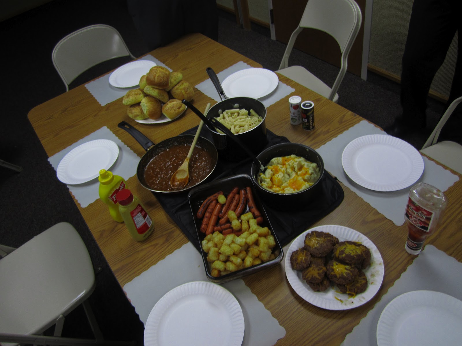 So on Sunday, our dinner appointment cancelled. So the elders and us decided that we would make our own dinner. We gathered everything that we could and ate it.... Our dinner consisted of hot dogs, walnuts, mashed potatoes, tater tots, cheeseburgers, chilli, pasta, and brownies. Yeah... It took us a while to recover from that meal. It was a lot of fun though!